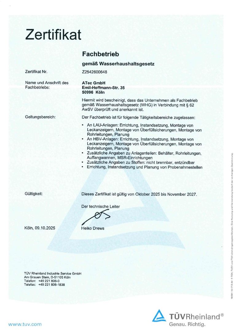 Durch unsere Zertifizierung nach dem Wasserhaushaltsgesetz sind wir berechtigt bestimmte Arbeiten an Anlagen mit wassergefährdenden Stoffen auszuführen. Somit können wir unsere Kunden optimal vor Ort unterstützen. Sei es für Montage- oder Instandhaltungsarbeiten.